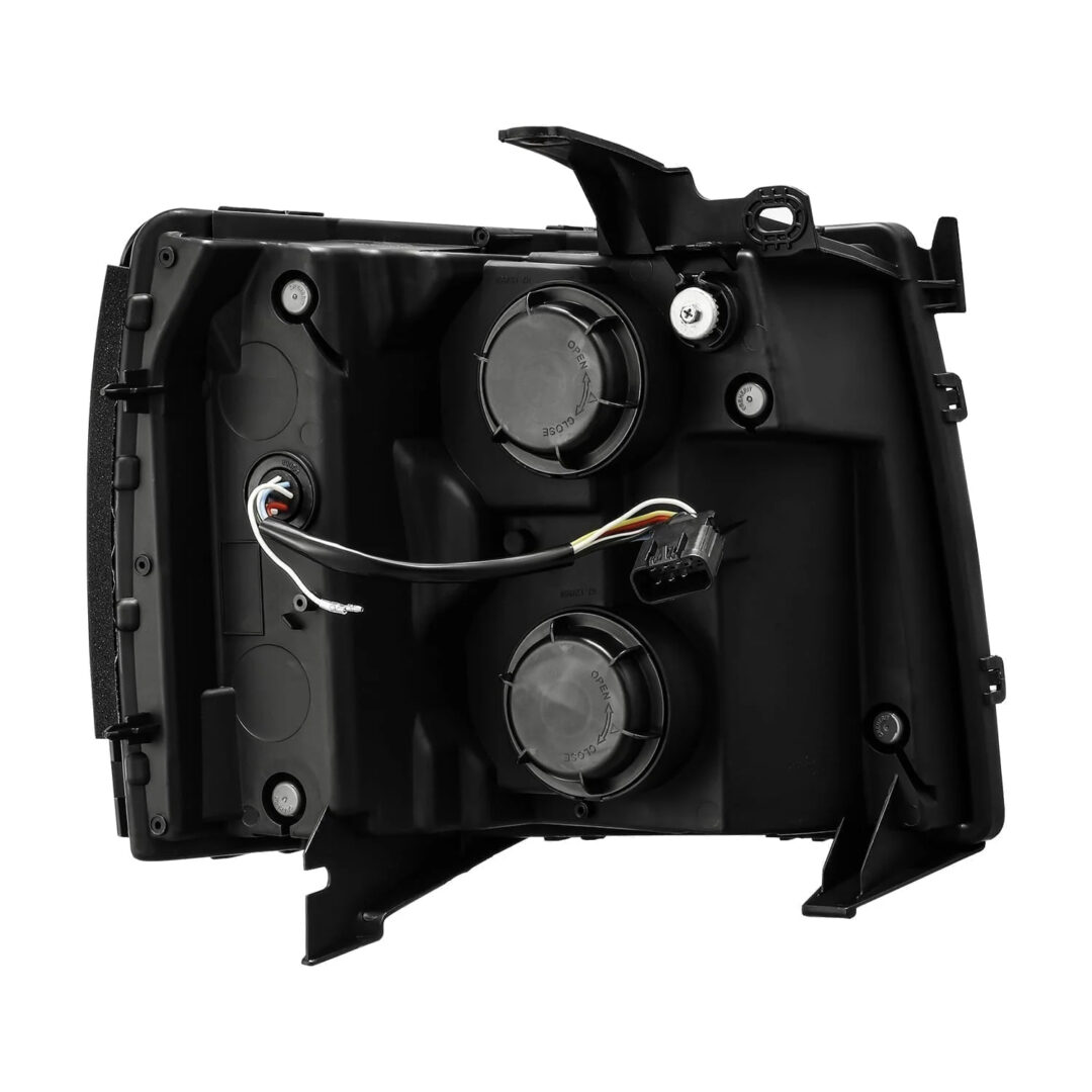 On the side of these 2nd gen Chevrolet Silverado PRO-Series headlights, amber reflector lenses are included to meet DOT regulations. The top projector is dedicated to low beam illumination, while the bottom projector handles high beam functionality. These 2nd gen Chevrolet Silverado PRO-Series headlights utilize H7 halogen bulbs for both low beam and high beam applications, ensuring reliable performance in various driving conditions. Elevate your 2nd gen Silverado with these 2nd gen Chevrolet Silverado PRO-Series headlights, combining functionality and style for an enhanced driving experience.