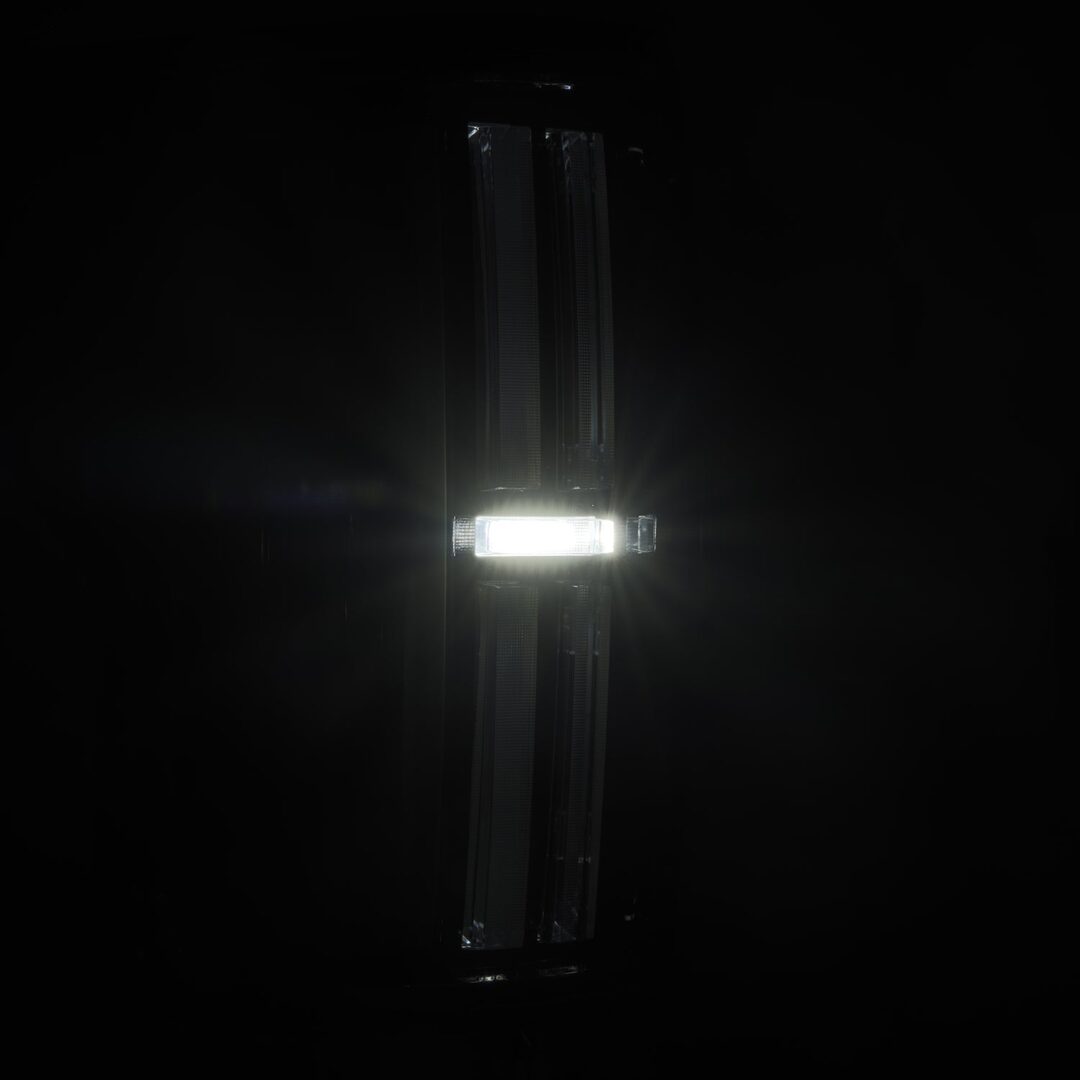 The trapezoidal prisms illuminate with red LEDs for parking lights, intensifying when braking. For turn signals, amber LEDs activate across the prisms and the LED side panel in a dynamic sequential flow, adding a modern touch. The side LED tube mirrors the signature look of the 3rd Gen Tundra, providing additional parking light functionality, while the central LED tube lights up with white LEDs as a reverse indicator.