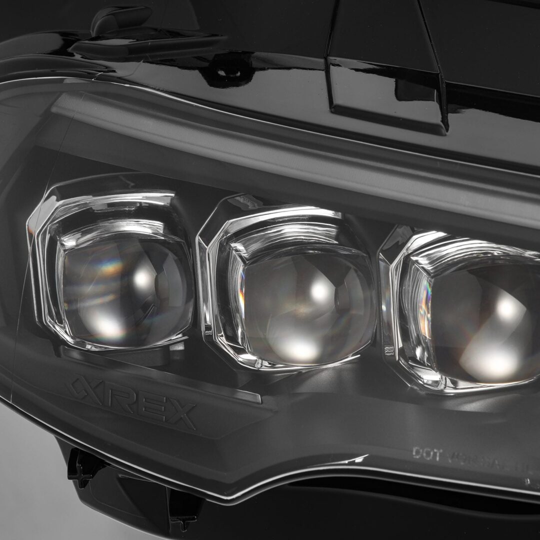 Our 6th gen Ford Mustang NOVA-Series headlights feature a tri-projector design, with all three projectors working as low beam and the outer two projectors also functioning as high beam. We use Osram Oslon black flat LED chips for the low beam projectors and AlphaRex LUXX LED for the high beam projectors.