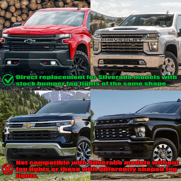Direct replacement for Silverado models with stock bumper fog lights of the same shape. Not compatible with Silverado models without fog lights or those with differently shaped fog lights.