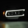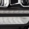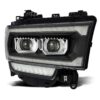 These 5th gen Ram 2500/3500/4500/5500 PRO-Series projector headlights boast a dual projector design complemented by a surrounding switchback light tube for DRL in white LED and sequential turn signal tube in amber LED. Additionally, sequential turn signals in amber LED are featured at the bottom. The inner projector is designated for high beam functionality, while the outer projector serves as the low beam. To illuminate the low beam, H7 halogen bulbs are utilized, and for high beam, H7 halogen bulbs are employed.
