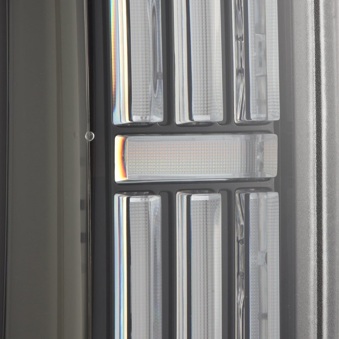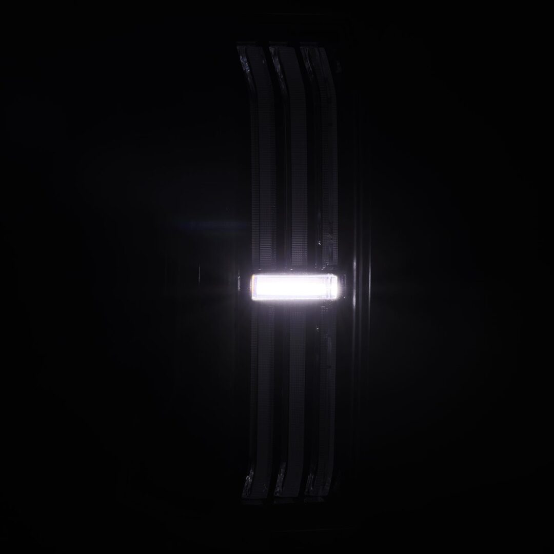 The trapezoidal prisms illuminate with red LEDs for parking lights, intensifying when braking. For turn signals, amber LEDs activate across the prisms and the LED side panel in a dynamic sequential flow, adding a modern touch. The side LED tube mirrors the signature look of the 3rd Gen Tundra, providing additional parking light functionality, while the central LED tube lights up with white LEDs as a reverse indicator.