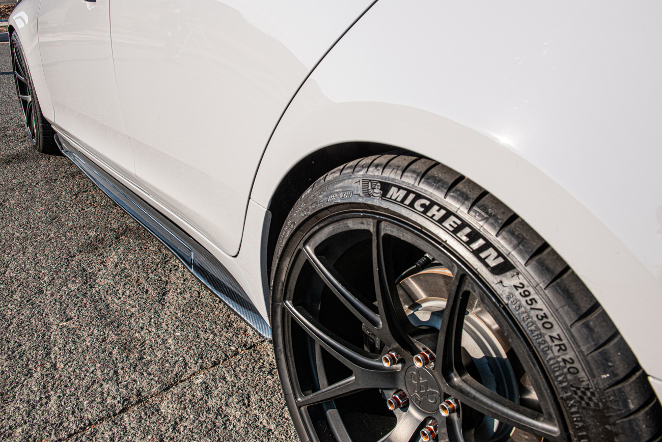 Carbon fiber is known for its excellent strength-to-weight ratio, making it a popular choice for automotive applications. The carbon fiber construction of these side skirts offers enhanced rigidity and durability while keeping the weight of the vehicle low. This can potentially improve the vehicle’s performance, including handling and acceleration. The carbon fiber side skirts rocker panels are installed on the sides of the vehicle, between the front and rear wheels. They extend the lower bodyline of the car, enhancing its aerodynamic profile and giving it a more aggressive and sporty appearance. The carbon fiber material adds a touch of elegance and sophistication to the vehicle’s overall design.