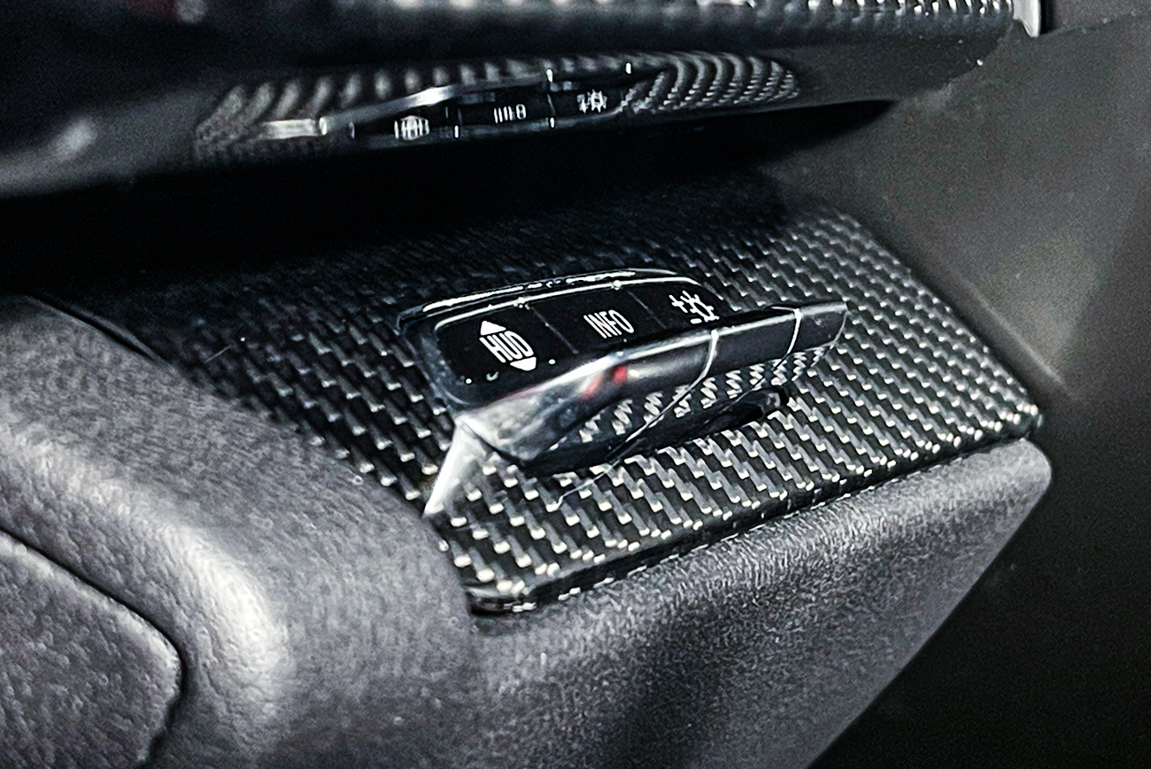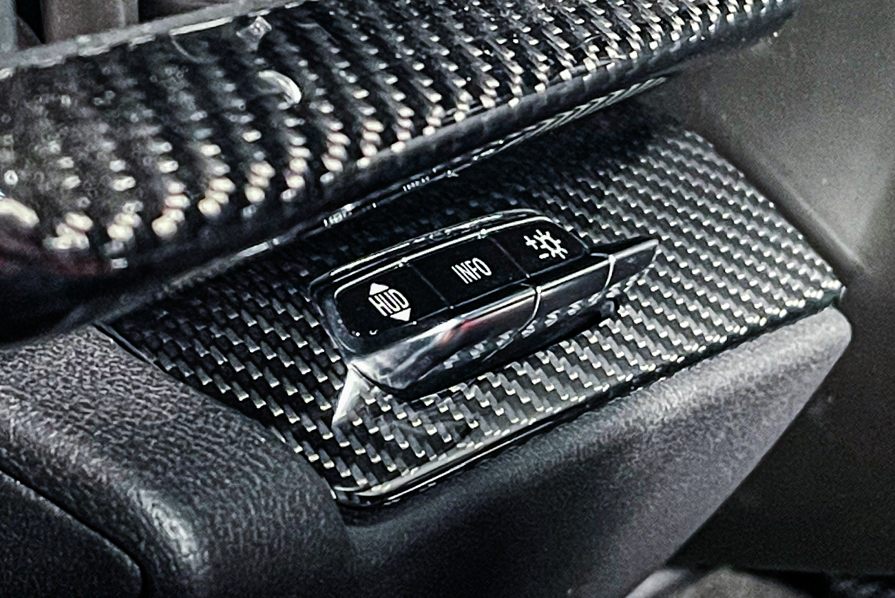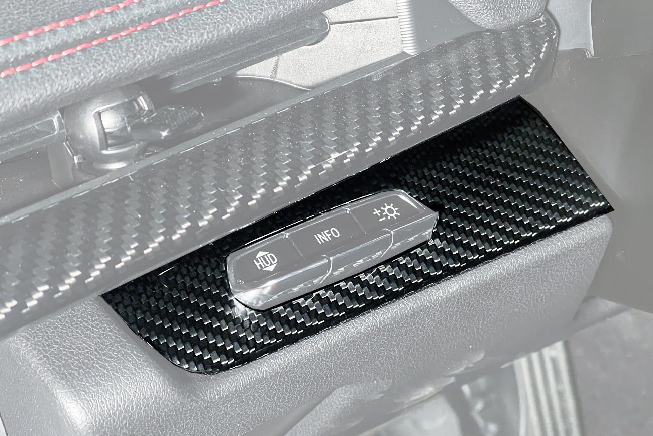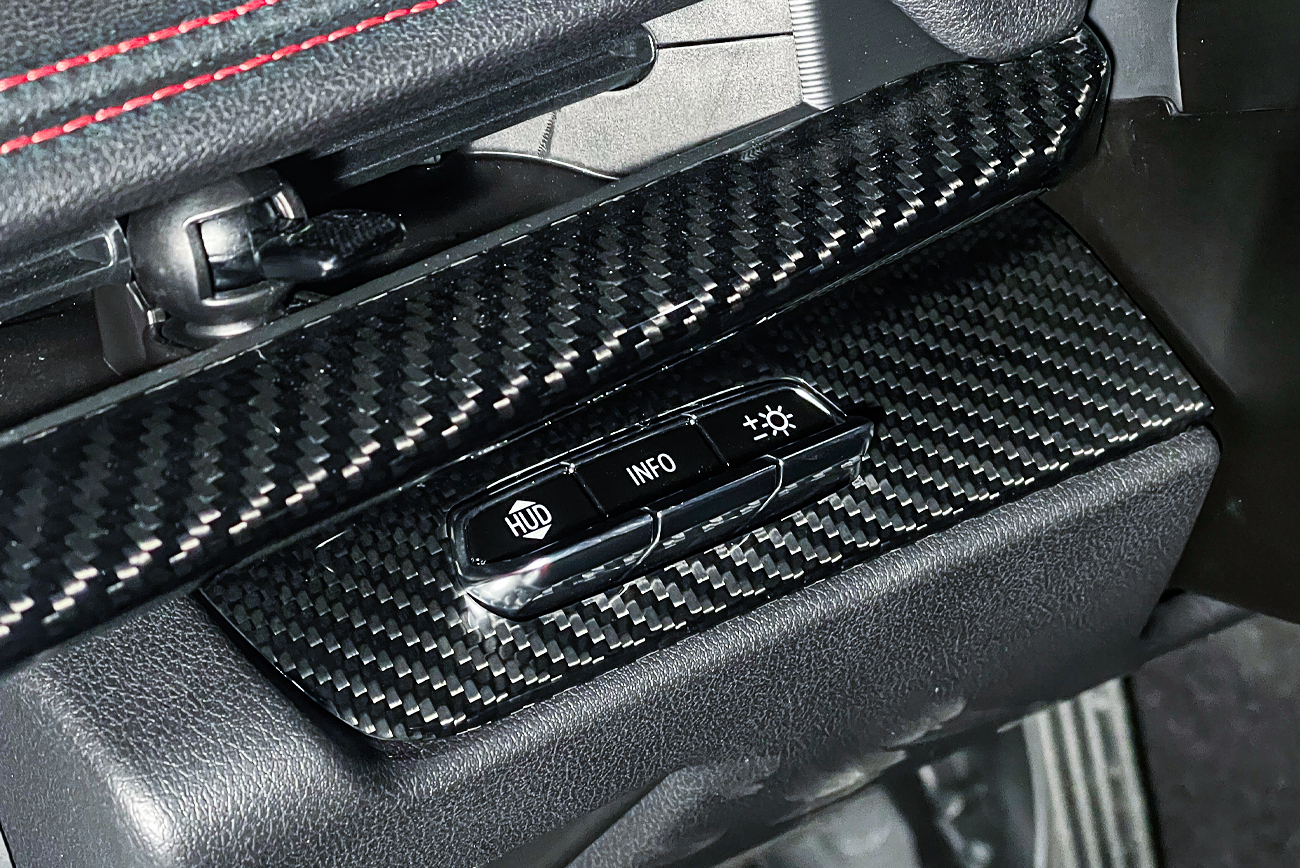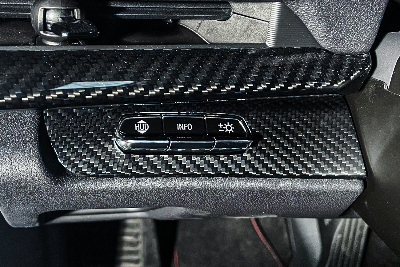 The glossy carbon fiber weave delivers a sleek, high-end appearance, giving your cockpit the same luxury feel as exotic performance cars. Each cover is precision-engineered to factory specifications, ensuring a snug and seamless fit around the HUD and headlight control switches without interfering with functionality.