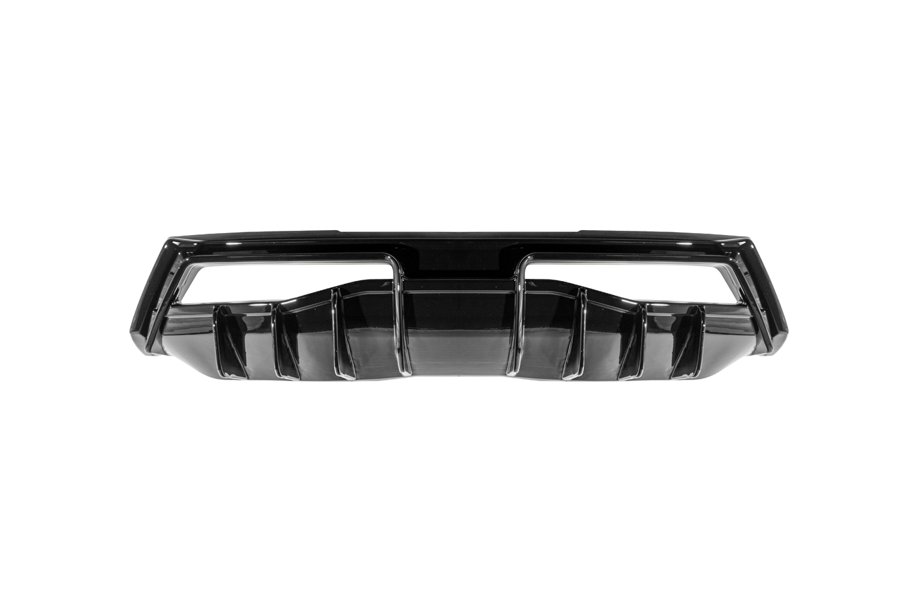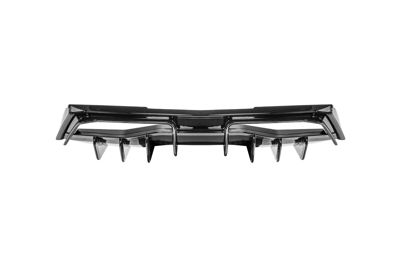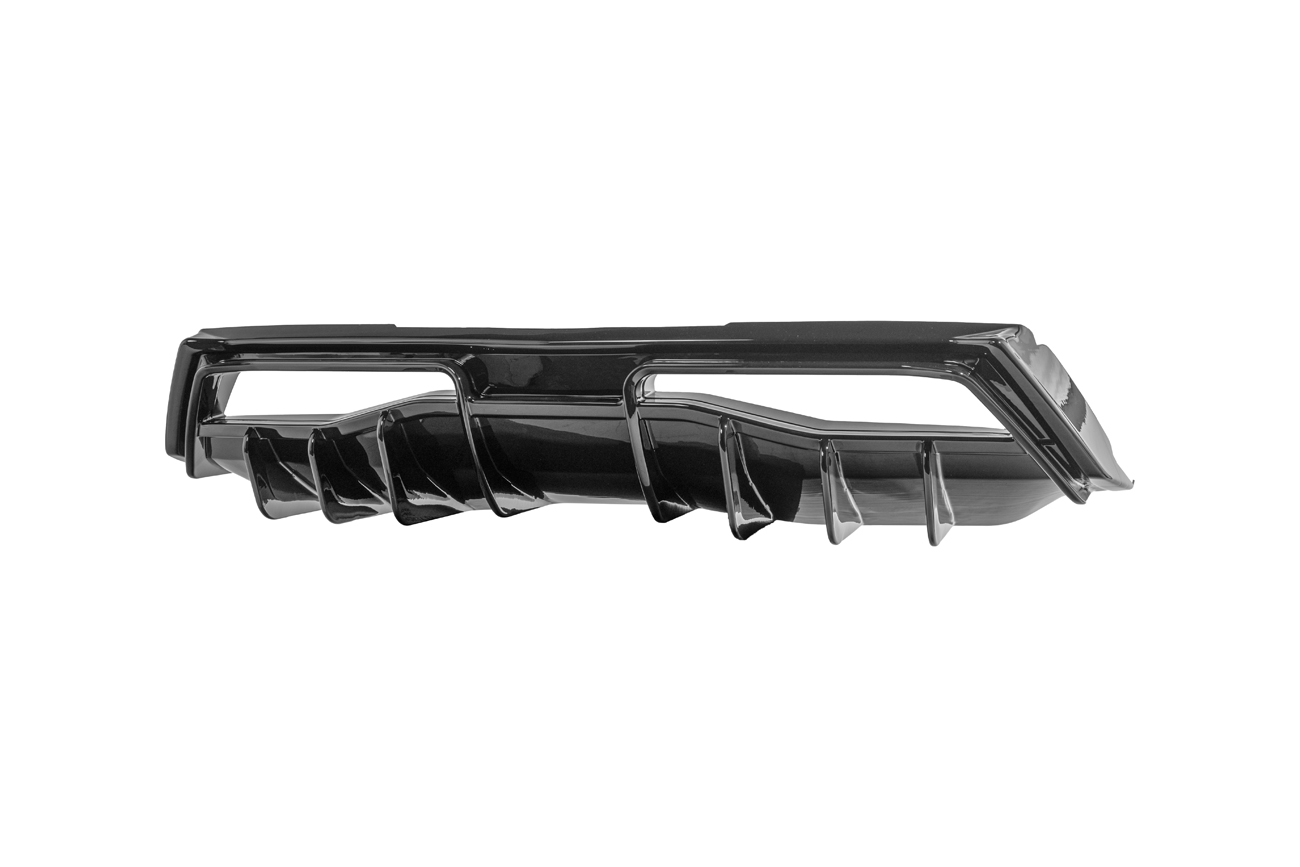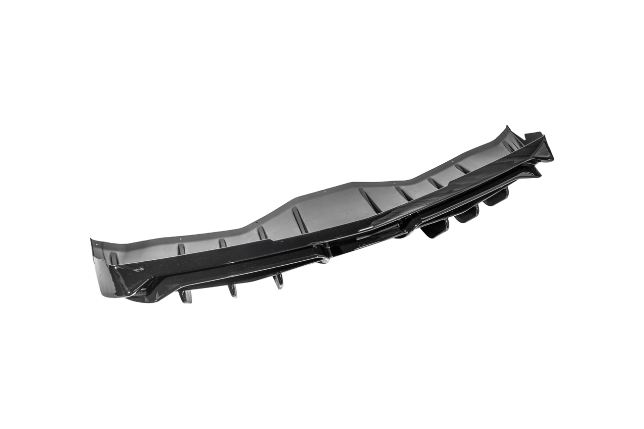 The Corvette C8Rear Bumper Add-On Diffuser Splitter Lip, designed for 2020+ E-Ray, Z51, and Stingray models, features a glossy black ABS plastic finish, enhancing aerodynamics and aggressive styling. (Not compatible with C8 Z06 models.)