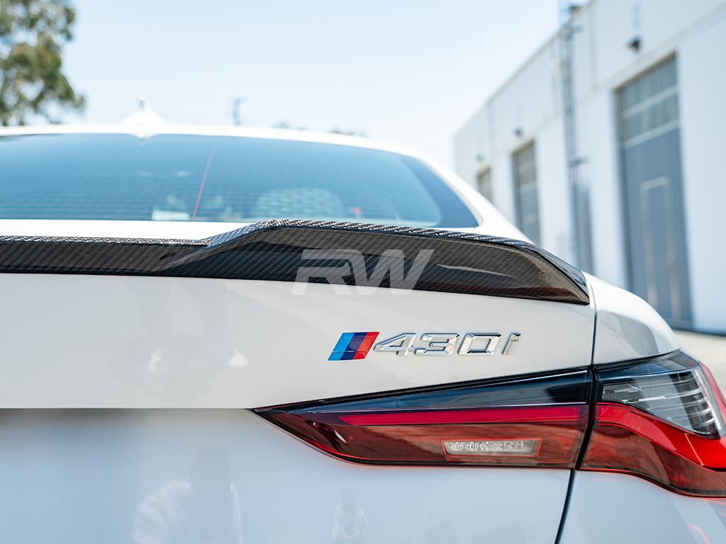 RW Carbon is proud to introduce the DTM Style carbon fiber trunk spoiler for the BMW G22 4-Series and G82 M4. This spoiler provides a sleek, yet aggressive look that perfectly complements other RW Carbon products. Installation is quick and easy, requiring only 3M double-sided tape. Each trunk spoiler is crafted using genuine carbon fiber in a 2×2 weave pattern and then clear coated and polished for a lasting shine. Upgrade your BMW’s appearance today with this lightweight, durable trunk spoiler. For any questions, feel free to reach out to us!