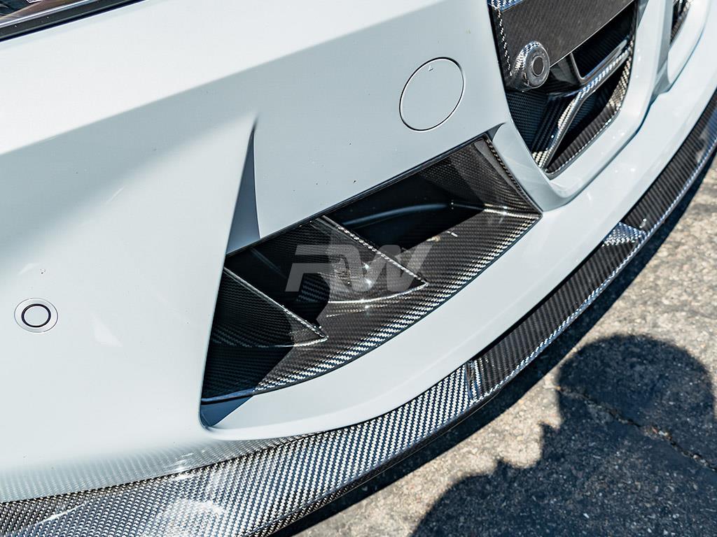 Get rid of those boring brake duct trims that came installed on your G80 M3 and G82 G83 M4 and upgrade them with our new Dual Fin Duct Trims. RW Carbon now has replacement-style carbon fiber front dual fin brake duct trims for the G8X that simply replace your OEM trims and re-use the same mounting locations. We handcraft each G8X M3/M4 carbon fiber front brake trim set from 100% genuine carbon fiber that will nicely match any other RW or OEM parts you have installed on your BMW. Just like all RW products, these carbon fiber front trims are bolt-on and do not require any special modifications to your G8X. Fits all 2021+ BMW G8X M3 and M4 applications.
